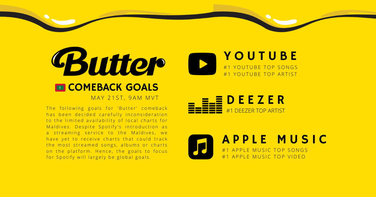 BTSXMALDIVES will be hosting weekly stream parties after the release of 'Butter'. Please make sure to keep track of the stream party announcements on our Twitter and Instagram!Streaming playlists across all available platforms in 🇲🇻 will also be released as soon as 'Butter' comes out on Friday! We will share 'Butter' playlists as soon as the release! Stay tuned!